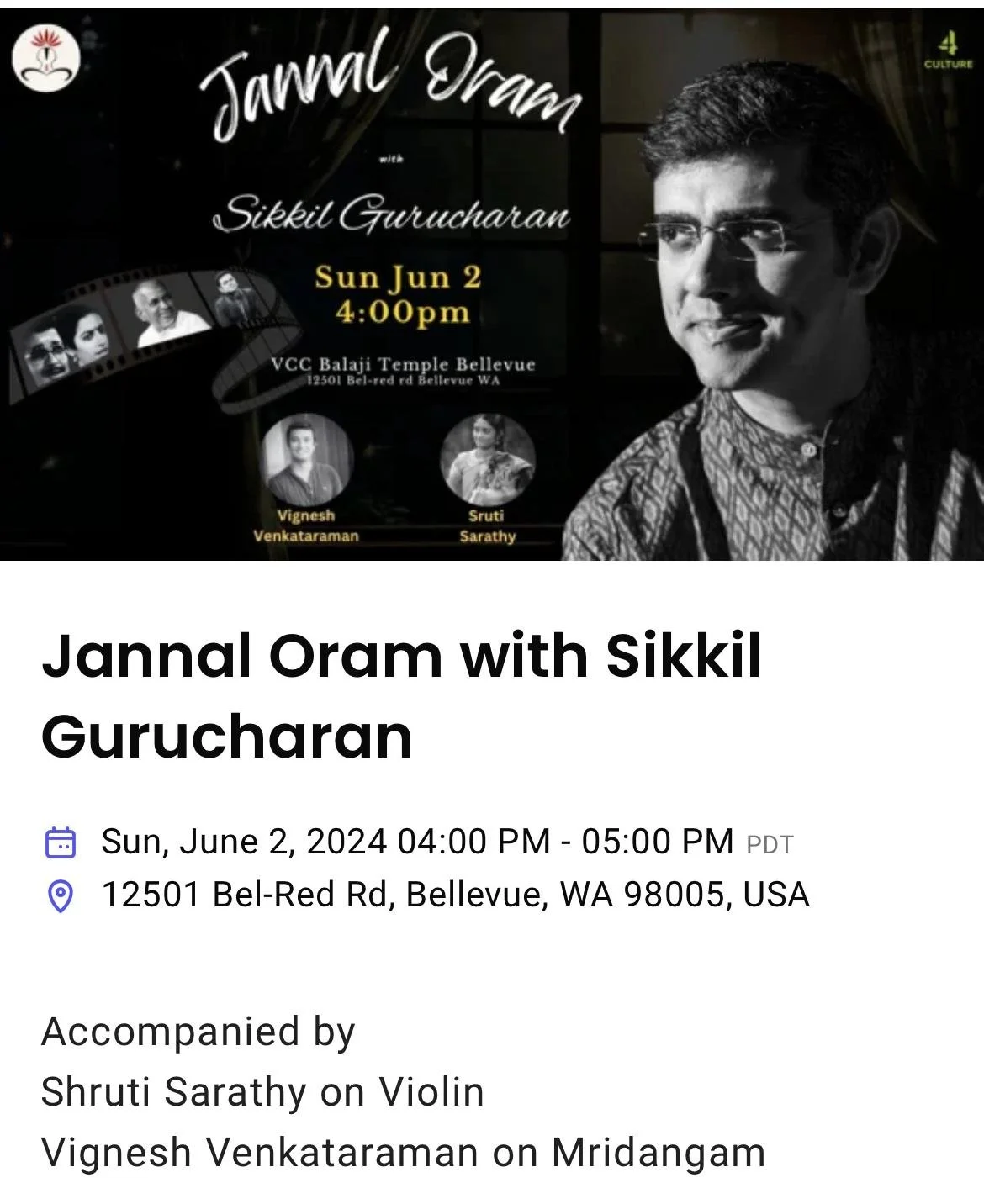 Jannal Oram with Sikkil Gurucharan Sunday, June 2, 2024 12:00 AM 11:59 PM 00:00 23:59 Seattle (map) Google Calendar ICS Jannal Oram with Sikkil Gurucharan SeattleJune 2, 2024, 4 PM